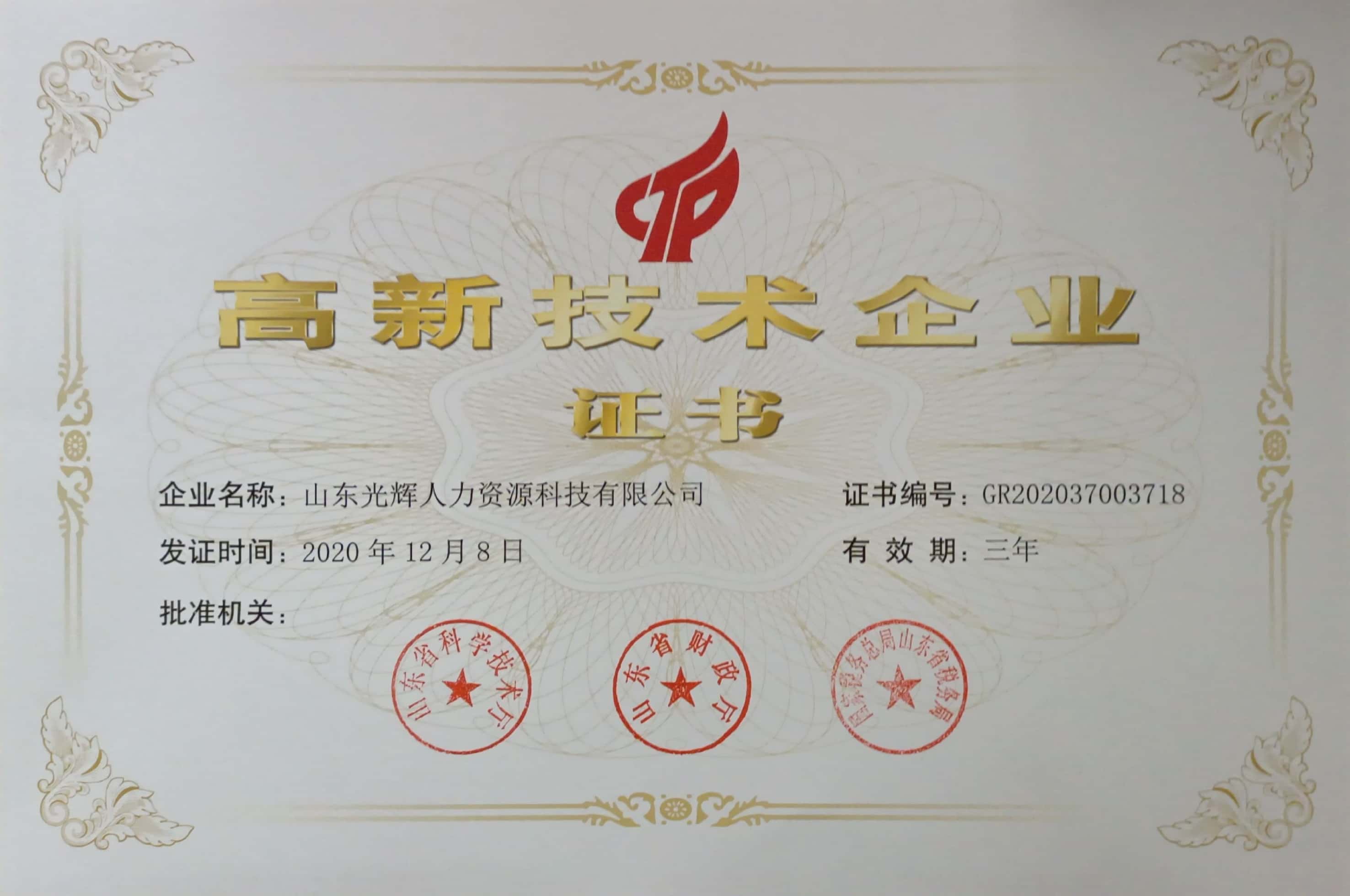 【喜報】山東光輝人力資源科技有限公司通過高企認定