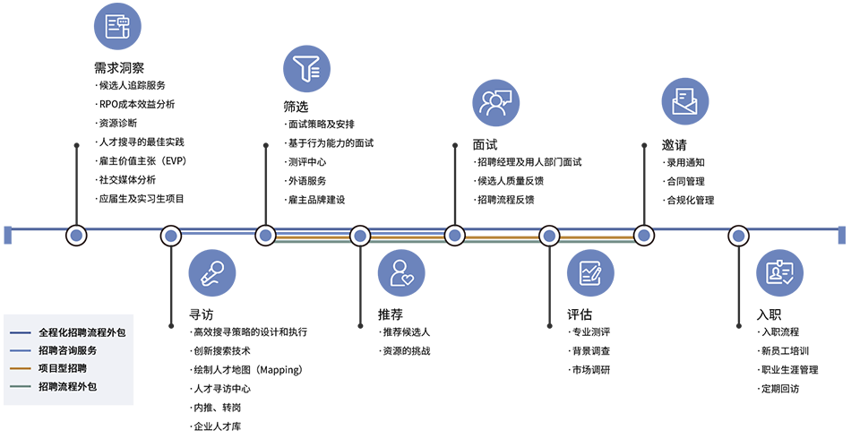 有針對(duì)性地提供部分或全流程招聘外包服務(wù)。作為一家專業(yè)的招聘流程外包服務(wù)商,我們旨在整合戰(zhàn)略、技術(shù)、資源及供應(yīng)商管理,以提供高效招聘流程服務(wù)。在服務(wù)過(guò)程中,我們將作為企業(yè)戰(zhàn)略合作伙伴與你的內(nèi)部團(tuán)隊(duì)緊密合作,通過(guò)流程設(shè)計(jì)、制定招聘戰(zhàn)略、人才尋訪、人才選拔、招聘決策、辦理入職、技術(shù)協(xié)調(diào)及核心業(yè)務(wù)數(shù)據(jù)的匯報(bào)等服務(wù),幫助企業(yè)提升招聘效率,提高招聘質(zhì)量,同時(shí)降低招聘成本。
